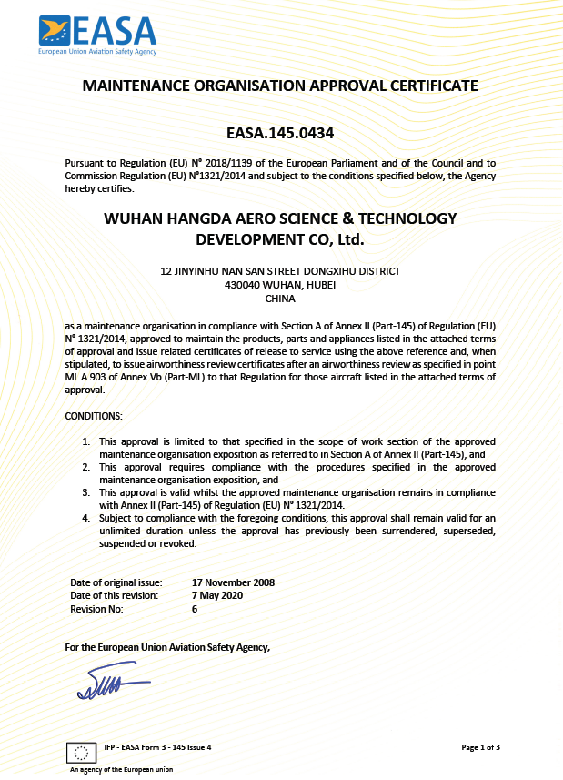 2020年5月  徑河廠區獲得EASA維修許可。